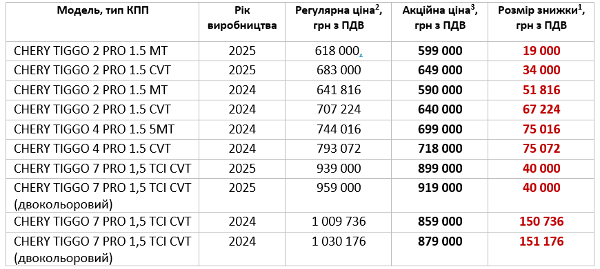 1 Під знижкою маються на увазі знижки від регулярної ціни в розмірі: 51816,00 грн - MT і 67224,00 грн - CVT на CHERY TIGGO 2 PRO Luxury (Лакшері) 2024р.в.; 75016,00 грн - MT і 75072,00 грн - CVT на CHERY TIGGO 4 PRO Comfort (Комфорт) 2024р.в.; 150736,00 грн - CVT і 151176,00 грн - CVT (двокольорове) на CHERY TIGGO 7 PRO Premium (Преміум) 2024р.в., на дату рахунку-фактури у порівнянні з ціною, що діяла до 13.07.2024.  Також знижки від регулярної ціни в розмірі: 19000,00 грн МТ і 34000,00 грн - CVT на ТIGGO 2 PRO Luxury (Лакшері) 2025р.в.; 40000,00 грн - CVT і CVT (двокольорове) на CHERY TIGGO 7 PRO Premium (Преміум) 2025р.в., на дату рахунку-фактури у порівнянні з ціною, що діяла до 25.09.2025. Суми знижок у гривні вказані з ПДВ. Зазначені розміри знижок не застосовуються разом з іншими знижками і не додаються до них. Знижки діють на обмежену кількість зазначених моделей CHERY TIGGO 2 PRO, CHERY TIGGO 4 PRO, CHERY TIGGO 7 PRO 2024 та 2025 року виробництва, що є в наявності в дилерській мережі ТОВ "СІ ЕЙ АВТОМОТІВ" на всій території України, за винятком АР Крим і тимчасово окупованих територій до 31.12.2025р.